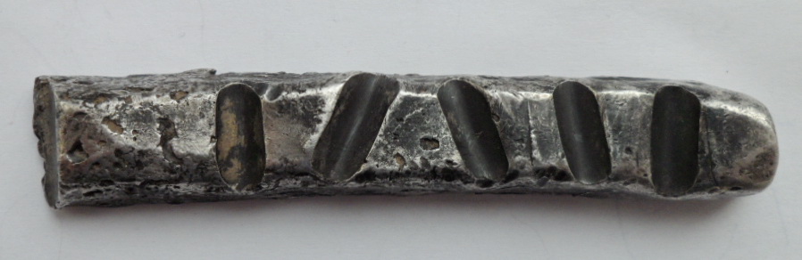 Вес - 106, длинна 92, ширина 12,высота 10. У него странный вид, такое мнение, что это когда то была новгородская полтина. Так как не вписывалась в местные стандарты по внешнему виду то её проковали в сечении до трапеции и нанесли характерные нарубки тем самым закрепив название "литовской". Какие мнения будут по данному слитку и как его называть? Сообщение отредактировано fil,: Apr 5 2013, 14:26 Вложенные эскизы изображений |