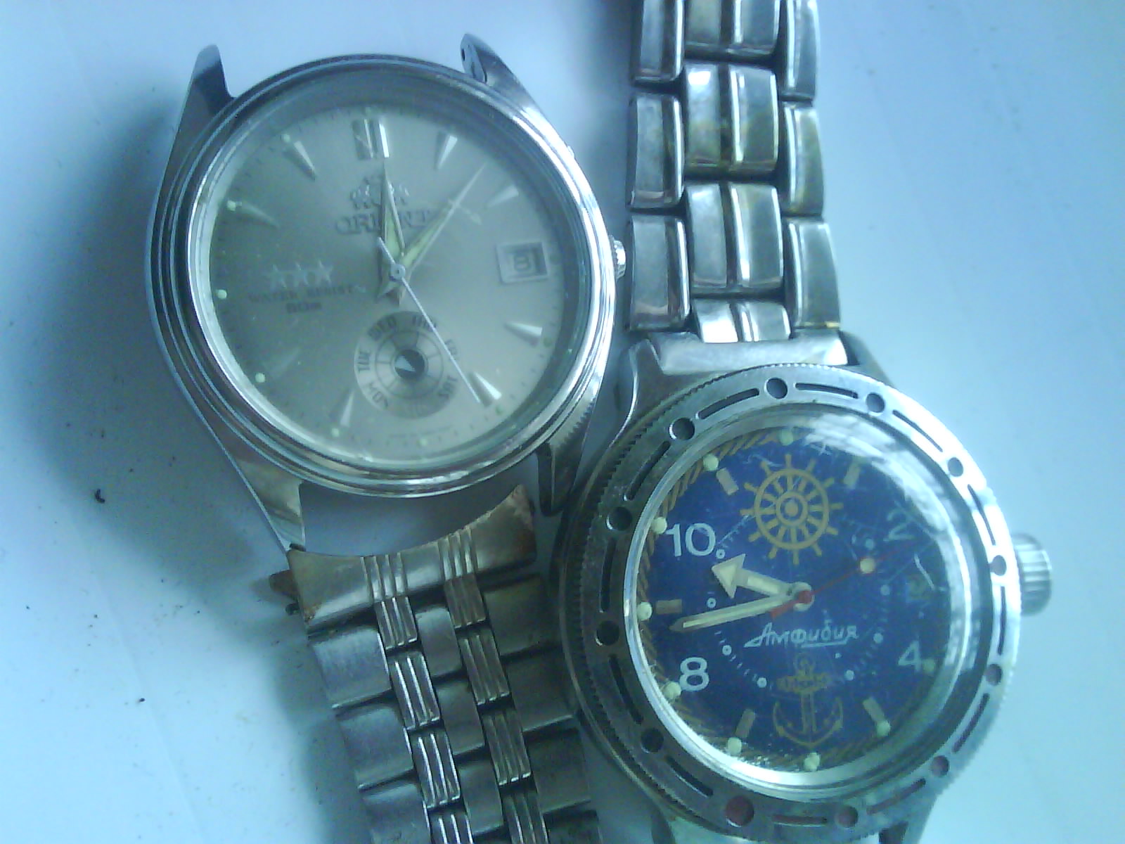 Вчера недалеко съездил покопать, в воде, но по старине. Монетки, крестики, блёсна, грузила, ну и часы попались Orient, а до этого наши - Амфибия. Амфибия водонепроницаемые до 200метров