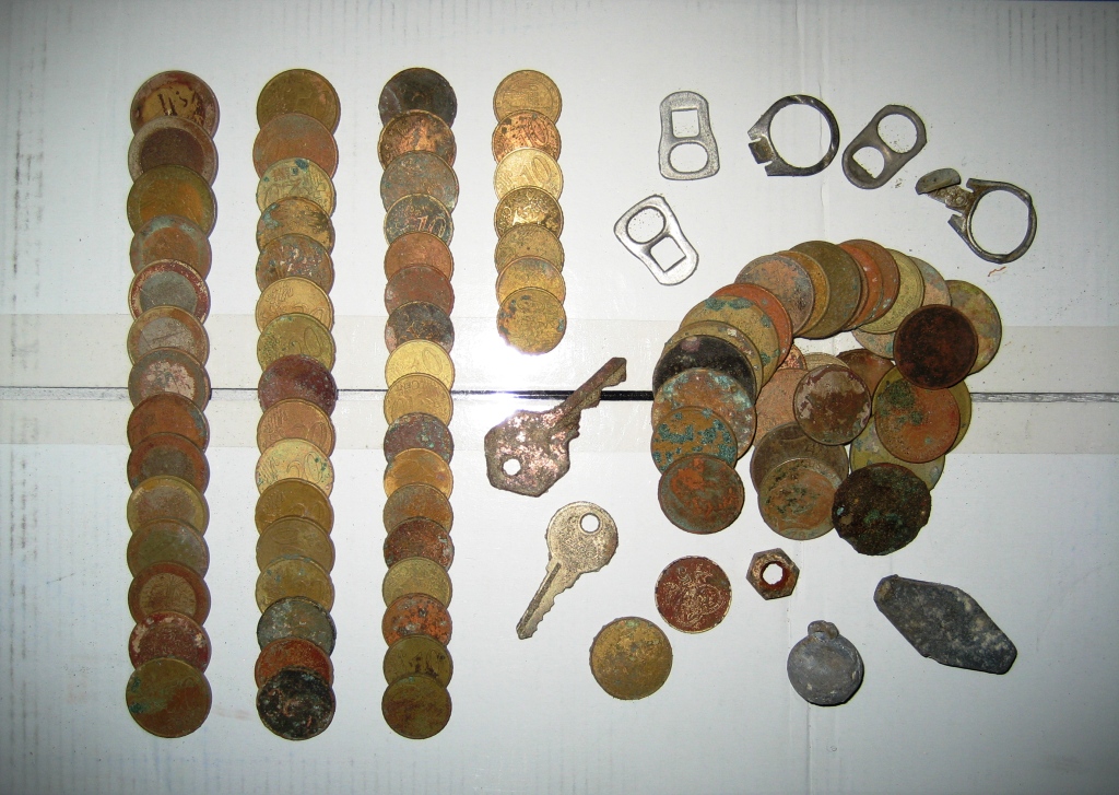 Сегодняшний коп не принес ничего особенного в плане находок, но порадовал колличеством целей! Копал не битый участок городского пляжа примерно 15х10 метров. За 2,5 часа удалось поднять 23 евро, не плохо, но бывало и больше,плюс много монет доеврового периода и конечно мусор в виде грузил, язычков, пробок,фольги и т.д. Так вот я подсчитал, что за 2,5 часа (150 минут) я нашел около 100 целей, это выходит 1 цель каждые полторы минуты! То-то я приехал домой какой-то уставший!