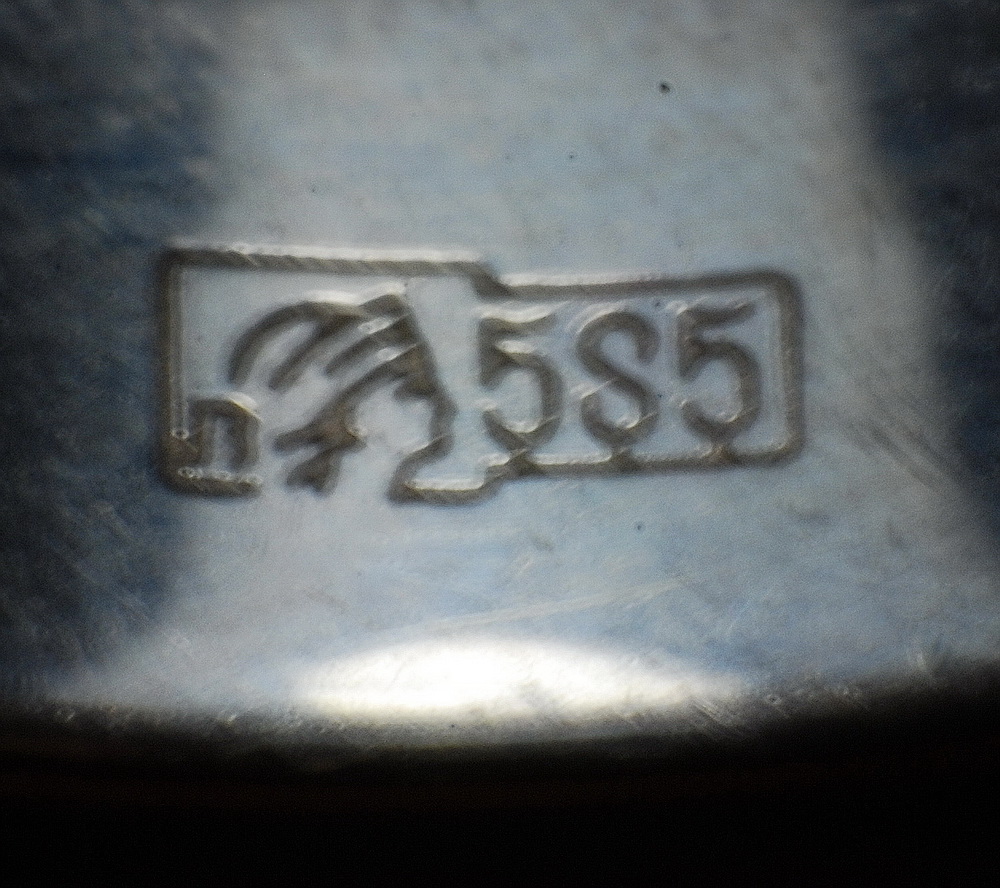 Сегодня открыл подводный сезон. Первый раз после покупки меча проплыл с ним по старым местам, где в прошлом году, как мне казалось, все выбил хантером. В результате нашел правильное колечко и сережку, также два полезных кольца, современной мелочи было столько, как будто прошлые разы ничего не собирал. По правильному сразу возник вопрос, по цвету похоже на 375 пробу, а клеймо какое то странное, подскажите кто с таким сталкивался, что это за проба?
