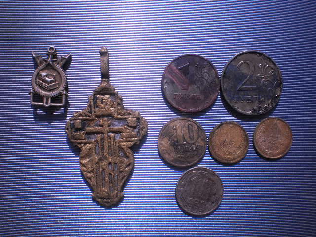 Майские. Долго собирался на один пляжик где работники Богатого промпредприятия отдыхают. Туда их фирменный катер ходит и подругому никак. Собрал я лодочку и поехал. Прибыл на место в 7-00 и до 10 прочисал все три небольших пляжика. Удивлению нет предела. На двух пляжах даже мусора бытового нет почти. Задумался уже о чистоплотности трудящихся. Но в конце третьего пляжа единственный и со вчера пьяный купающийся поведал мне, что по весне намыли на пляжи новый песочек и похоронили все потеряшки под свежим и красивым. Зчем чистить пляж от грязи, намыл новый и ВСЕ. Но не пропадать же дню и собранной лодке, поехал я на некии базы отдыха на берегу Днепра, там пьянствовал народ и веселить их я не стал, но нашел возле, Общественный пляж куда местные селяне жодят. Метров 70. Итог - правильного 0, неправильного - 0, бижутерии НЕТ, мелочи СССР+Незалежна Украина Жменя. Вот еще наблюдение - сельский пляж от городского отличается кол-вом пробок от водки(город 100 пиво-15водка, село - 70 водка 10 пиво)Вообщем не мой день. Но погода+прогулка по воде и физические упражнения, при моей офисно-сидячей работе - это есть Хорошо
