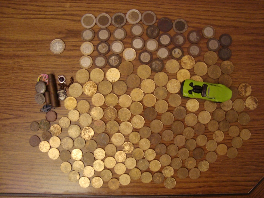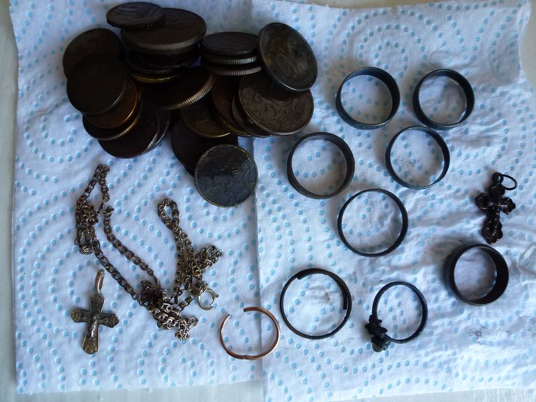 Сегодня появилась свободная минутка и решили рвануть на водичку, жена порыбачить, ну а я покапать. Совместить приятное с полезным. Далеко ехать не стали так как времени на мероприятие предполагалось не много. Махнули на один не очень популярный городской пляжик, не копал я там года два. В итоге полный голяк, поэтому решил перейти на основной городской, благо до него было метров сто. Особых надежд не чаял, так как бил я этот пляжик в том году по осени. Ну лишь бы покопать и пустым домой не ехать. Отработал по честному четыре часика, долбил все сигналы подряд не перебирая, ну и вот собственно результат - три серебрушки, полушка 1912г, раниие советы и прочая хрень.