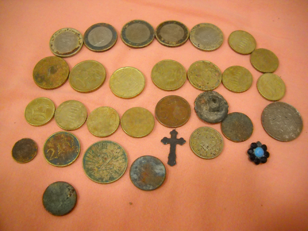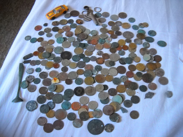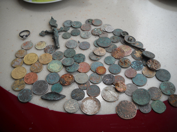 Всяко бывает. Как то зацепил кусок тонкой веревочки, вся изодранная и в узлах, и опять же на узлах малюсенький ржавый ключик и крестик из желтого металла, но со следами ржавчины. Дело было ночером, и сослепу чуть не выкинул нах, да что то удержало. Дома разглядел как следует-ОНО! А ржа с ключика отложилась, как оказалось.