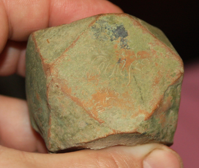QUOTE(Sombrero @ May 8 2011, 00:51) Вот такая штуковина попалась довольно увесистая. Когда выкопал первые мысли были от какого-нибудь водопроводного стыка до древней булавы. Имеет сквозную дырку. Внутри вроде остатки деревяхи. Потом дома увидел, что на всех 4-х больших гранях надписи: "Калуга", "1822 года", "апреля", "30 дня". Есть у кого мысли что это такое? Была идея что набалдашник от трости. В принципе похоже, но тогда наверно дырка была бы не сквозная. противовес от весов |