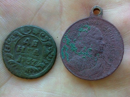 Вчера тоже немного покопал,какаликов штук 8 из них пятак 1924 года мертвый фоткать не стал....порадовала деньга в малахитовой патине и под конец медалька убитая вроде в честь морского сражения при Гангуте 1714 год,а Питерские опять отличились 2000 чешуевин подняли в Новгородской.