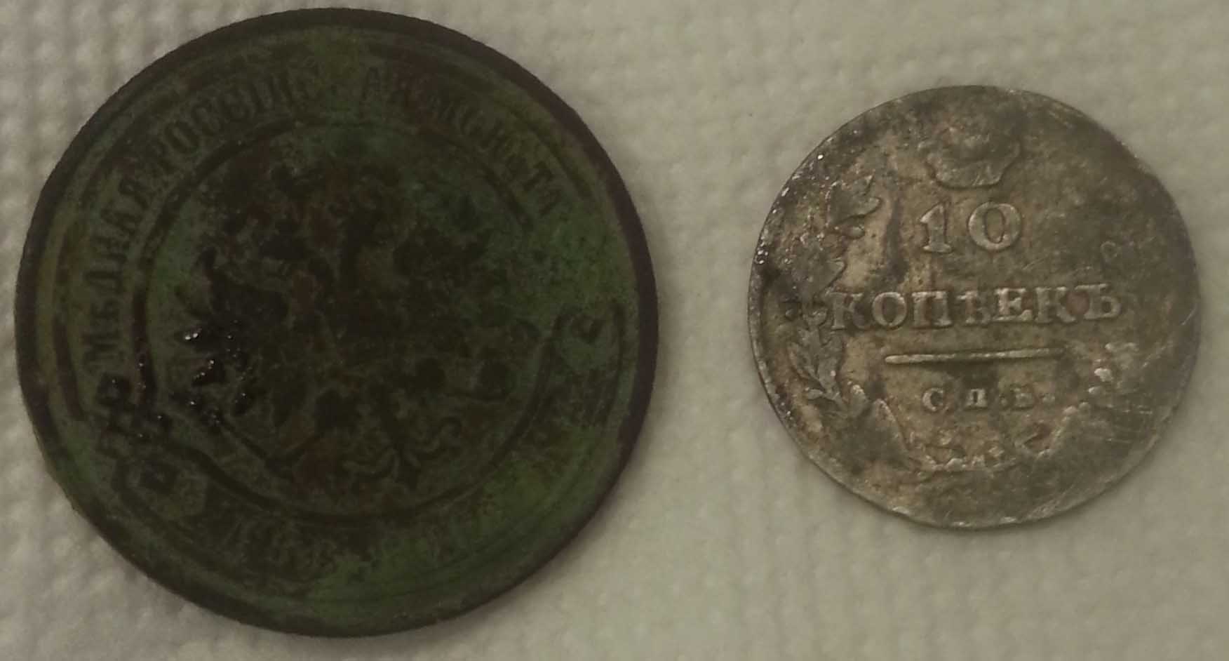 ездили с напарником под Гатчину на кошенное поле и на свежею распашку Попалось 6 монеток, медаль 300 лет дому Романовых, корона и серебряная серёжка с зелёным камушком 2 копейки 1810 года пчёлка гурт шнурок -------------------- Мой первый видео отчёт про коп http://www.youtube.com/watch?feature=player_detailpage&v=LFwW0U8FIFg