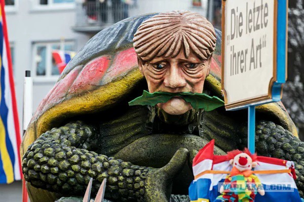 Не , ну как же)) Бабку не забыли))-"Досталось и канцлеру Германии, Ангеле Меркель, её изобразили как черепаху с грустными глазами, жующую зелень.