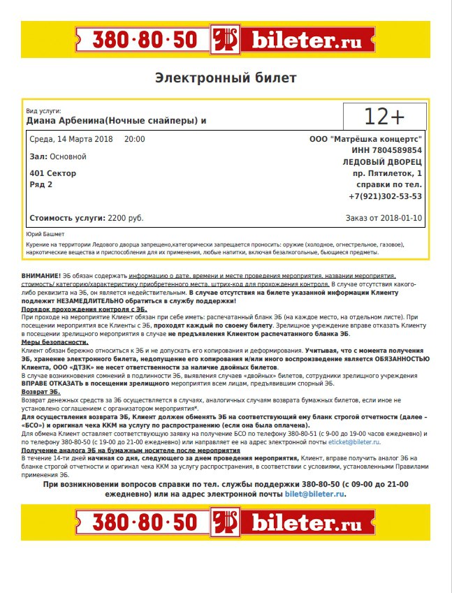 Камрады. Есть два билета на "Ночных снайперов" с оркестром Башмета. Концерт в среду (14 марта). Сами поехать не можем по причине болезни. Цену 2200р. х 2 немного скину. Покупал онлайн. Возвращать буду только в последний день.