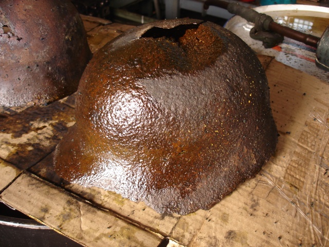 Второй способ - замочить в растворе уксуса или соляной кислоты(я растворял стакан или два уксусной эссенции на 20-литровое ведро из-под замазки, 6 касок вместились). 2-3 дня выдержать, потом смыть с касок кислоту(можно с содой). Зачистить железной щёткой или спецнасадкой для дрели или болгарки. И опять-таки обработать преобразователем ржавчины.