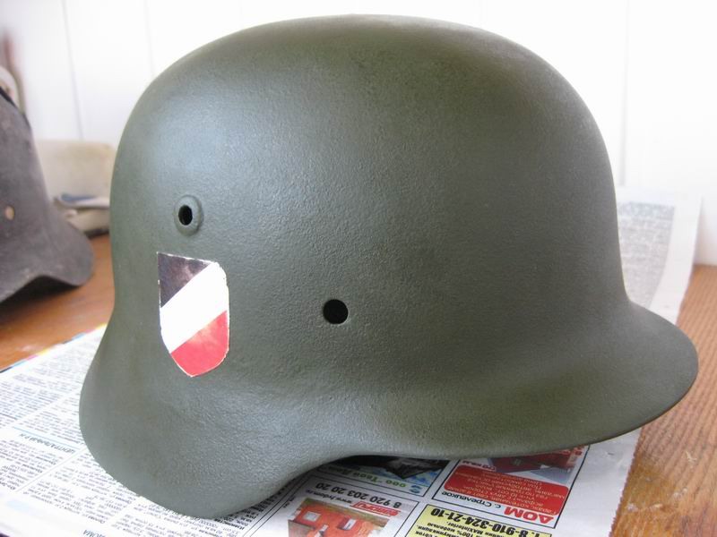 Вот,по вечерам,после работы реанимировал еще один вариант,для полки..подшлемы буду ваять зимой....краску мешал сам,кому интересно,могу рассказать подробно весь процесс..спрашивайте..деколи немного затер,немного попозже затру саму каску слегка..типа слегка заношенная...На очереди еще несколько шлемов,один из них сейчас в лимонке бодяжится..сделаю,тож выставлю..