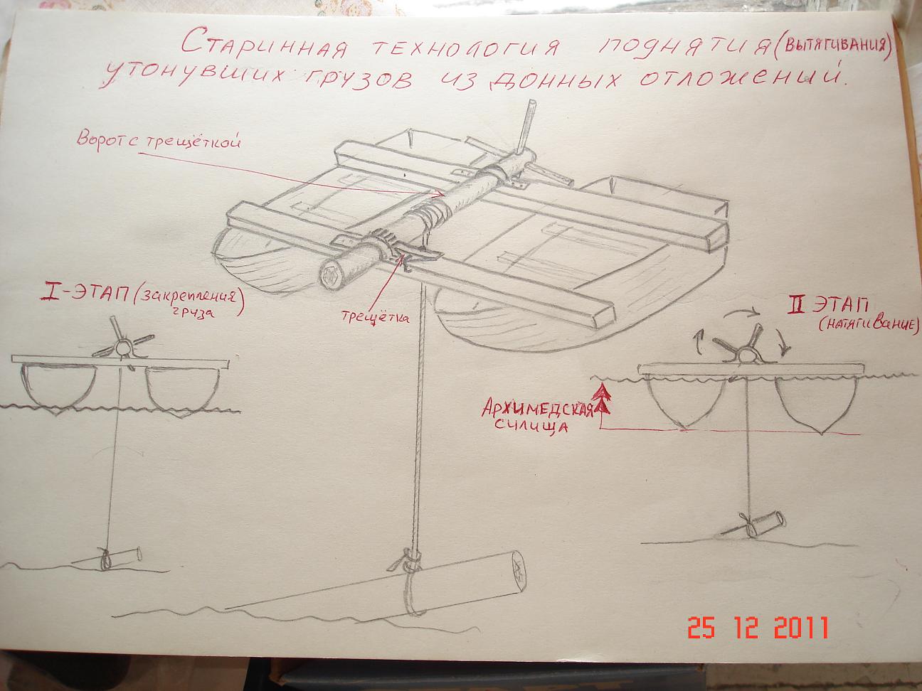 Основанна она на той же архимедской силе. Для этого необходимо: 1. 2 лодки с высокими бортами (не надувные) 2. Ворот с трещёткой. 3. Прочная не тянущаяся верёвка. 4. Пловец (ныряльщик), который может привязать верёвку к бревну под водой. На рисунке я думаю более менее всё понятно. Добавлю ещё, что верёвку натягивали до тех пор (если бревно очень крепко засосал ил) пока лодки не погрузятся в воду почти до самого края борта. В таком положении лодки оставлялись на ночь. За ночь архимедова силища делала всё сама. Если за ночь бревно на вытягивалось всё. Утром подтягивали верёвку воротом опять до тех пор пока борта почти не сравняются с уровнем воды. Всё просто и не надо ни каких компресоров и балонов. Есть много всяких старинных технологий о которых мы и не знали. Сообщение отредактировано Send: Dec 25 2011, 13:50 Вложенные эскизы изображений |
