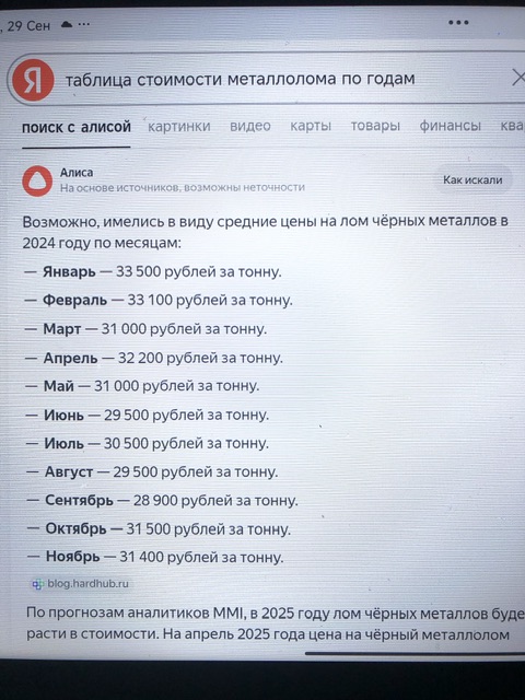 QUOTE(Трюфель @ Sep 29 2025, 16:01) Думаю,что Алиса здесь не причем.Это в большей степени зависит от того информационного поля в котором она находится.Если бы у нее был опыт как у В..тор или других опытных поисковиков то прогноз был бы на 100% верный.А так имеем что имеем.Вот наглядный пример “недобросовестной рекламы”… Специально поинтересовался какая цена на данный момент.Мне ответили что информация “слегка” устарела и стоимость металлолома 12 ₽ если привозишь больше тоны.А так и того меньше.Но самое интересное что совсем недавно у них была информация про 35 тыс.за тонну. |