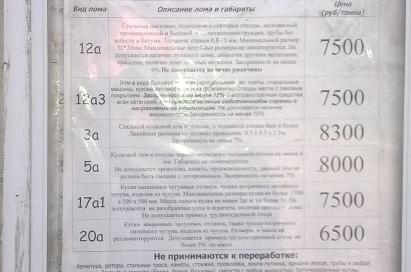 QUOTE(Sанчес @ May 5 2014, 22:34) Наши цены, северо-восток Ленинградской области. Это в 50 км от меня, у нас, у частников ещё меньше, примерно на 10 процентов. Цены на приемном пункте на 29.04.2014. Наименование Засор (%) Цена за 1 кг. (руб.) Медь гр. А (блестящий провод от 2 мм) 0 175.00 Медь гр. А-2 (кусок, провод от 2 мм) 1 170.00 Медь смесь 2 165.00 Медь стружка 6 150.00 Кабель медный (толщина жилы от 3 мм, цена за металловыход) по факту 145.00 Латунь 0,5 80.00 Латунь стружка 6 65.00 Алюминий электротехнический 0,5 40.00 Алюминий смесь 2 30.00 Алюминий профиль АД-31 1 35.00 Алюминий эл. шина 0,5 35.00 Алюминий пищевой 0,5 37.00 Алюминий банки 6 20.00 Кабель алюминиевый (толщина жилы от 3 мм, цена за металловыход) по факту 26.00 Нержавеющая сталь 2 25.00 Нержавеющая сталь стружка 6 15.00 Никелевые сплавы (по хим.анализу — за 1% чистого Ni) 0,5 2.40 Свинец кабельный 5 / 10 с битумом 35.00 Свинец литьё 6 30.00 Свинец грузики для балансировки колес 30 30.00 АКБ пластиковый корпус 7 без электролита 15.00 АКБ эбонитовый корпус 7 без электролита 14.00 Цинковые сплавы 5 15.00 Сталь 3А (толщ. от 4мм, габарит) 4 6.00 Сталь 5А (толщ. от 4 мм, негабарит) 4 5.00 Сталь12А (толщ. от 1 мм до 4 мм, габарит) 5 5.50 Сталь12АН (толщ. от 1 мм до 4 мм, негабарит) 5 4.50 Сталь 12АЦ (оцинкованная, толщ. от 0,5 до 4 мм) 5 4.00 Сталь 5АТ (смесь габарит, негабарит, чугун, толщ. от 1 мм) 6 5.50 Сталь 13А (проволка) 5 3.50 Сталь 2Б22, 3Б22, 5Б22 (низколегированная, марганцовистая, траки) 5 4.50 Чугун 17А (габарит) 6 5.50 Привет земляку! у нас на юге Лен обл цена такая Вложенные эскизы изображений |