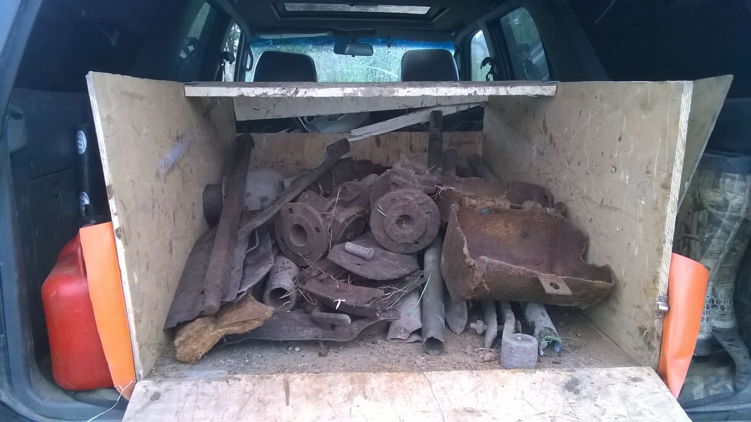 Всем привет! Обследовал территорию бывшего колхоза, который существовал на этом месте до 1957г. Железа практически нет. Попадается мелочь , не относящаяся к сельхоз технике.Или тогда по другому относились к технике , или гаражи были в другом месте. Пришлось ехать на сильно заросшую уз-ку. на машине по ней не проехать и тачку не протащить. Выкопанное железо приходится таскать на руках к машине. Вчерашний результат примерно 150кг. Напарник к копу охладел, как только закончились большие объёмы.