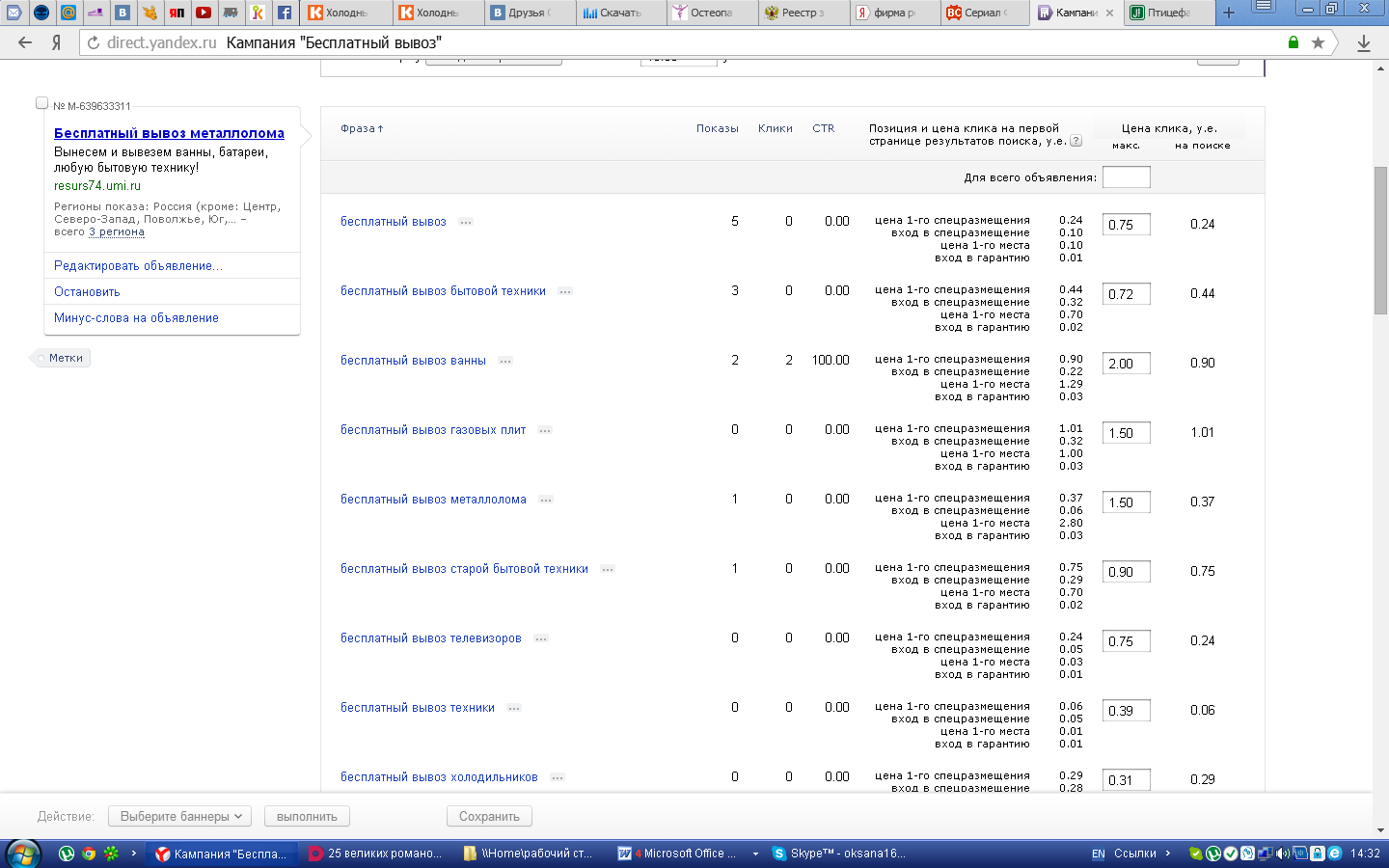 Сначала создаём простенький бесплатный сайт-визитку. Набрал в поисковике - бесплатный сайт и дальше, как говорится, действуем по инструкции. Вот этот - My Webpage я примерно часа за три сделал, просто вставил свой текст и картинки. Дальше даём рекламу на Яндексе (контекстная реклама – Яндекс Директ). Т.е. если кто то ищет бесплатный вывоз чего либо, то на первой странице в самом верху будет ссылка именно на наш сайт. Функционал у яндекс директа очень большой: время показа объявления, города или городов где будет показываться объявление, подбора ключевых слов для Вашего объявления и т.п. Оплачивается реклама так: сначала забрасываешь определённую сумму на счёт яндекса, корректируешь стоимость кликов по твоему объявлению, а потом уже деньги списываются именно за клики. Т.е. нет фиксированной платы а платишь именно за количество кликов по своему объявлению. Стоимость кликов это как аукцион (грубо говоря), идёт постоянное изменение стоимости, конкурент поднял стоимость и соответственно вытеснил тебя с первого места (яндекс тебя извещает что ваша ставка «перебита»), заходишь в директ и повышаешь ставку. Ну и так до разумных пределов, пределы определяются рентабельностью того «дела» которое вы рекламируете. Для наглядности пару скринов как это работает. Одна условная единица – это тридцать рублей. В гугле есть аналогичный сервис, но как показывает статистика, 80% россиян пользуются яндексом. Бывало что за пару дней набиралось прилично металлолома (ванны, плиты) и техники (стиралки, телевизоры и т.п.). Объявление можно в любой момент остановить или же возобновить. Мы занимаемся этим если есть свободное время от основной работы. Сразу скажу ванны это тяжело, 100 кг спустить с пятого этажа вдвоём это не шутка(((. Сообщение отредактировано sakom: Dec 4 2014, 13:22 Вложенные эскизы изображений |