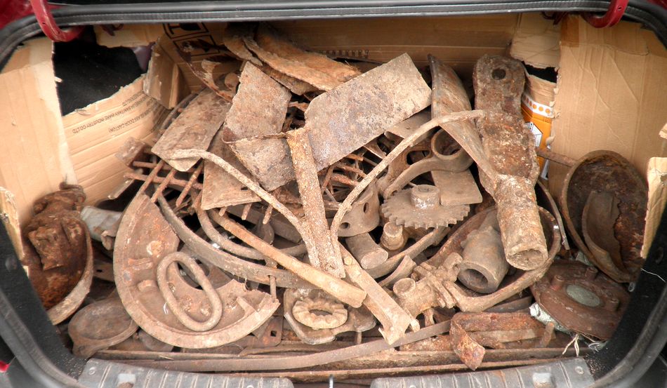 У меня уже потихоньку багажник наполнился,думаю,ещё сигнал бонусный выкопаю и домой,а тут ещё и дождь начал моросить.Попался сигнал,странный,и по размеру крупняк должен быть. На глубине штыка,ни как размеры не нащупаю,всё в металл упираюсь.Потом поддел всё таки и поднял гусеничный трак,а за ним второй тянется,а там третий и в глубь уходит.Очистил примерно,что бы количество понять,штук 7-8.В общем думаю и тяжеловато,да и места маловато.Засыпал назад,потом заберу.Сегодня пока машина по работе ехала с города,поехал на приёмку и сдал 230 кг. Съездил по работе,только пообедал в 14 часов,напарник другой водитель звонит-поехали мол подготовленный металл соберём.В субботу с ним полазили у нас по курмышам и кое что заготовили.Одну железку прямо рядом с домом откапали.Собрали всё железо поехали загрузили гусеничный бонус,кислородный баллон.Вентиль сшибли кувалдой как положено и я уже вторым рейсом на приёмку,дождь опять моросил и я про фото забыл.В общем 320 кг. уже без засора. Вложенные эскизы изображений |