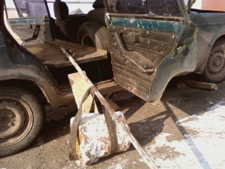Так он еще на метр почти в земле был .Я его поставил на попа наклонил на одну сторону и подсыпал под нее земли потом на другую..... пока на поверхностью большая часть показалась потом ломом ковырнул и усе осталось до машины доволочь.... возле машины противовес опять на попа лом просунул в дырку ..на плечо под лом тапок и.....готово