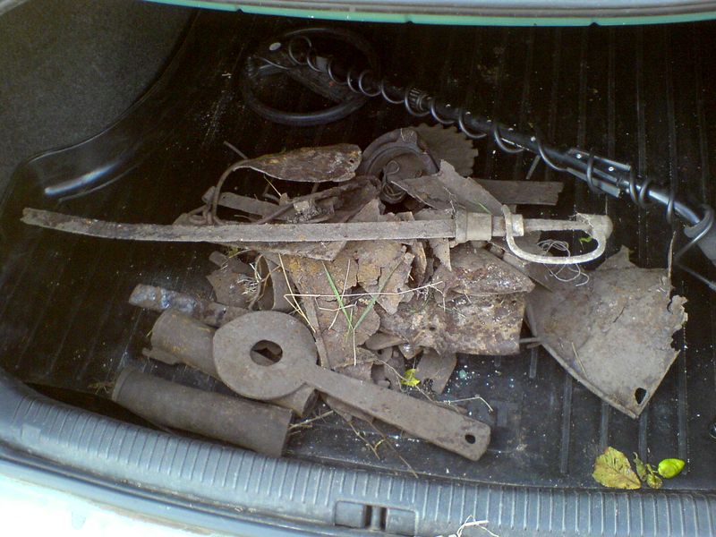 вчера помимо поиска монет и прочих артефактов в конце поиска положил прибор и отнёс в машину в багажник все железяки весом от 3-х кг примерно каждая, которые были заботливо выкопаны другими коллегами и сложены в аккуратные кучки, и ещё зачем-то выбросили медную пластину весом килограмма полтора