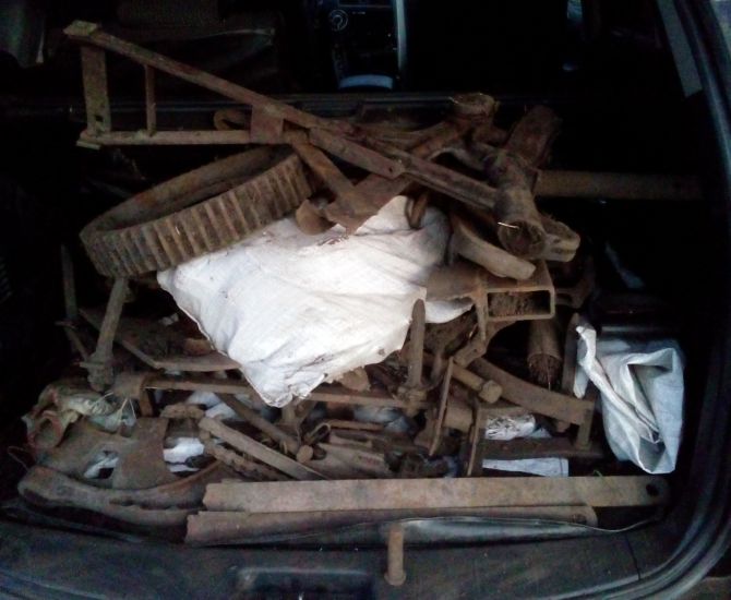 Вчера съездил покопать попадалась всякая мелочь ну и к разговору вот это. Вес бороны оказался 35 кг.Взвешивал электронными весами две половинки,на днях была на 40 кг,но меньше 25 кг никогда не встречал.Есть привычка на рыбалке взвесить рыбу а также и при сборе металла.Хотя по ощущениям спорить не буду не тянут они на такой вес,лодочный мотор ямаха 9.9 весит 36 кг, но мне кажется очень тяжёлым.Тут видимо существует фактор удобно или неудобно поднимать предмет.Штангисты поднимают огромные веса а дай им тот же вес в неудобной форме вопрос поднимет ли.А лемеха маленькие 1.5 кг большие 3.5-4 кг. Ну да ладно,разобравшись с бороной продолжил копать и вылез такой переросток Тут я вспомнил Шуру Балаганова и понял что борона была разминкой Итог дня был такой. Да парни подскажите такая шестерня чугун или нормальное железо. Всем спасибо и удачи. |