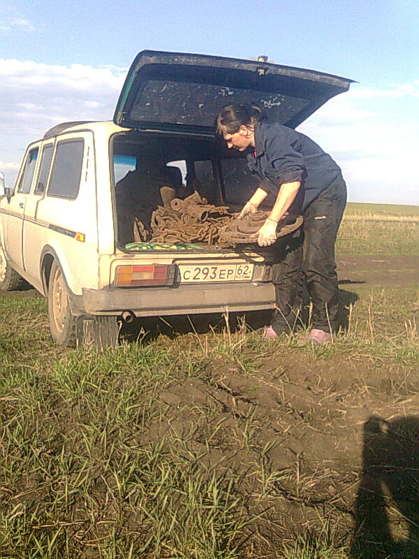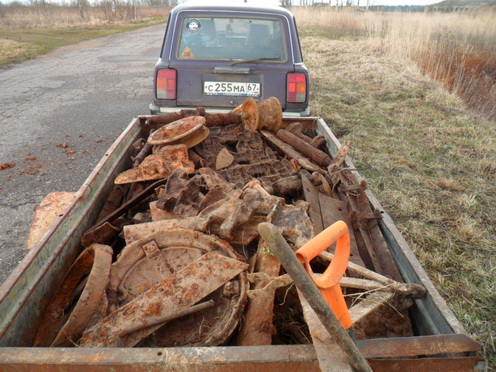 в первый день поехал под вечер на место бывшего щебзавода, что в черте города.(3.5км от дома). особово ничего не надеялся найти. думал насобирать килограмм 30. приехал значит , включил прибор , достал лопату . даже настраивать ничего не стал. по всей земле валяются обломки жб плит , вперемешку с битым шифером и кирпичами. только сделал пару шагов, бац, мощный сигнал. ну думаю, наверное плита. но все равно стал копать. смотрю камни идут- остатки фундамента. а в том году по осени как раз под этими фунд. я находил неплохие железки. ну расковырял я камешки, и тут лопата ударила по твердому. рука у меня уже набита [/IMG] . сам я ее не смог из ямы вытащить(может быть и смог бы , да спину рвать не охота). пришлось ехать обратно за товарищем. итого 146кг, и она видать еще и обломана, сколько же интересно она целая весит. (у меня были похожие железяки, но значительно меньше, весили от 40кг до 42. только волны покрупнее, и сама она изогнутая по всей длине, и на концах у ней имеются шлицы-отливы так что одну можно как бы соединить с другой.) это уже дома при взвешивании [/IMG].так начался мой сезон.теперь приведу пример по поводу металла в посадках [/IMG]. на самом поле стабильно шли.... жд костыли, но их не копал, да и копал именно в посадке, не отвлекаясь на другой металл. потом пошел на свое излюбленное место - ржд -, и прошев буквально метров 10 , наткнулся на целую кучу металла. вот [/IMG] , выкопано на пятачке 1х1м и глубиной см 40. выкопав почти все , решил что хватит на сегодня, так как солце жарило уже будь здоров. когда возвращался домой, то немного подсел [/IMG] . обычное подкладывание веточек под калеса не помогло, и когда увидел , что машинка уще легла на коробку, то стал домкратиться. думаю , чтоб под колеса подложить. камней нема, а потом одумался таки , у меняж полный багажник прекрасного для этих целей металла. короче через час выбрался [/IMG]. когда поскладывал весь металл обратно , то конечно же прошелся по колее с мд, и конеч но же металл в виде 1 лемеха и 1 подкладки там был. а раньше ведь мд небыло, и металл не забирали(правда раньше наврядли ездилиб с металлоломом в багажнике) ну и наконец собственно хотел сказать что 2т за неделю это не мало. и вот простое сравнение. [/IMG] . эт я накопал за день работы(с 11 до 20-30). а это результат 2х дней [/IMG]. в этой горе почти 500кг(487). на вершине виднеется связка из латунных фигнюшек на 7кг латуни, + еще какаято штуковина бронзовая. но после этих двух дней , на 3й я уже непоехал |