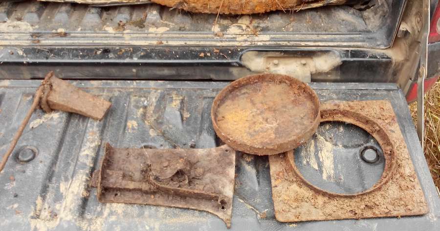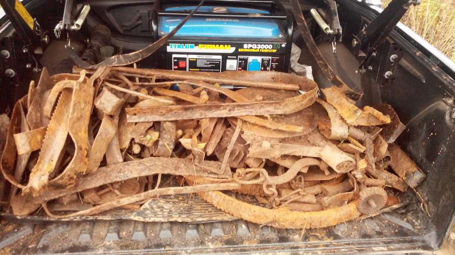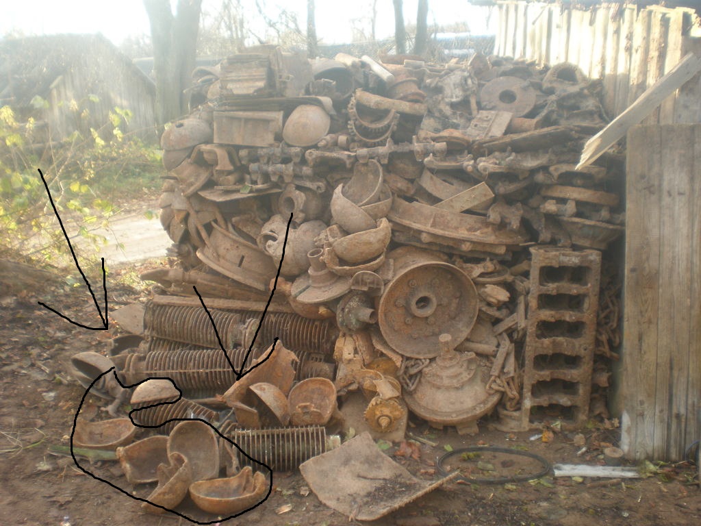 [quote=ВсёПочестному,Oct 12 2017, 09:06] Хочу попросить совета у опытных Коллег! Где предположительно могла кузница на деревне находиться? Добрый Вечер Всем. Именинника с Днём Рождения!Всех благ! Не большой отчётец поиска кузницы)! В первый день решил проверить место под номером 2. Там травы меньше и подъезд есть.Кузни там не было,но была похоже пилорама,так как много попадалось пил и обломков "зубастых").Ещё остатки какого то механизма,тяги,вал,косые шестерни,мелочь.Хотел пофотографировать,но как назло дождь начался.Пока до авто таскал,грузил,вымок до нитки(!Уж и не до фото... В итоге 218 кг. Сегодня снова сгонял туда.Место ном.3 разведал.Похоже там была кузница.Много железок мелких.Обломки от котла какого то толстостенного.Обручи,кольца,ставни,шарниры всякие.Метрах в 50 две огромные ямы.Предположил что уголь жгли для кузни. Место под ном.1 разведал.Железо есть,в основном запчасти....,но очень трава высокая,оставлю на весну. Во второй половине дня заморосил дождь,снова не дал докопать!Скромный итог 236 кг.) Замок старинный с механизмом оставлю на память))),нужно почистить только. Всем Добра! [/quote] Если "пилы" те что в багажнике по краям, то это от зерно молотилок вроде. |