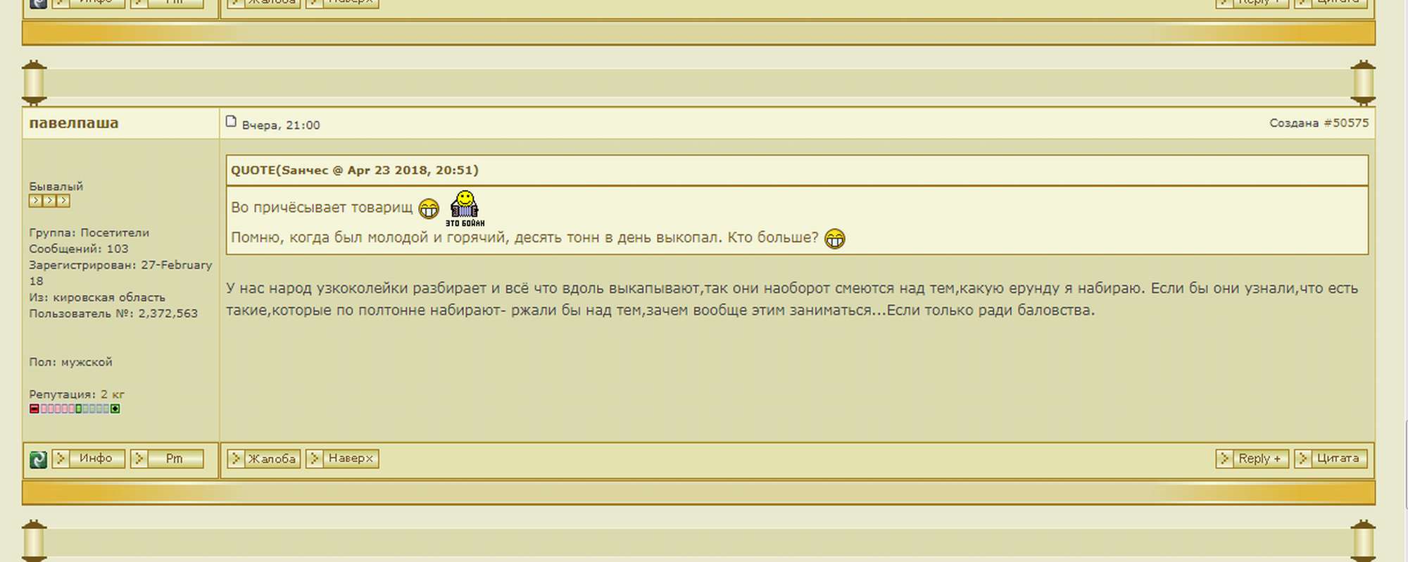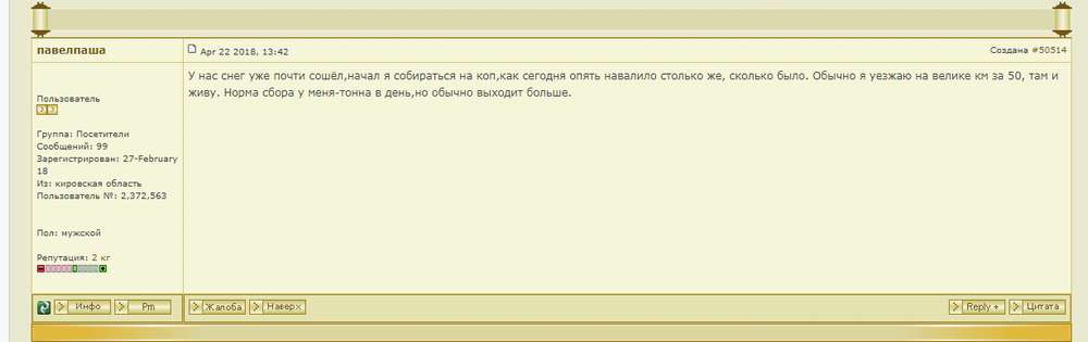 QUOTE(павелпаша @ Apr 24 2018, 11:07) Там был такой контингент,которому было пофиг на всё,кроме бухла...Те же люди убирали пер.Газетный. Какой хабар я оттуда выпер,лучше и говорить не буду. По ходу,вы кроме себя вообще никому верить не привыкли...подумали бы для начала,зачем мне толкать левый гон вообще. Вот если б за это мне платили,тогда чем чёрт не шутит... Да почему не верю то...,верю конечно! Сумками антиквариат в скупку.... Что ж тут не обычного то? Бригада пьяных работяг.... И всё в полной тайне,покрытой мраком... Киров огромадный тааакой,мегаполис!Не кто и не слыхал что на Герцена 44,в поповском доме сумками антиквариат вытаскивают! Что ж тут не верить то... Эка какая невидаль! Да и Залежи с/х техники,узкоколейки,под носом,практически,что на Газели доехать можно,о которых никто не знает....И всё это в 20км,ой в 50 км....ведь дальше Вы не ездите,на лисапеде!(из Ваших сообщений). В Окатьево вообще клондайк оказывается,в 37 км.от райцентра и никто не знал...И это не смотря на то что дальше Даровского Вы вообще не бывали(тоже Ваши слова) Как же тут не верить...? Что ж.. Удачи в наступающем сезоне! С нетерпением ждём фото добычи чермета от 1 тонны,до 3 -х тонн в день!Стабильно,так...Именно добычи руками,из земли,с помощью металлоискателя! Покажите нам настоящий коп,а то разбиральщики узкоколеек смеются,что ерундой занимаемся,полтонны какие то......200-250 кг.,в лучшем и то порой найти не можем Ну а потом уж и в репутацию Вам отмечу,за труды ...или зелёненьким,или уж красненьким Сообщение отредактировано ВсёПочестному: Apr 24 2018, 11:45 Вложенные эскизы изображений -------------------- Весь день не спишь, всю ночь не ешь — конечно, устаёшь... !