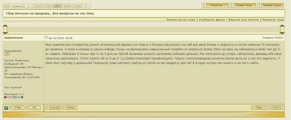 А откуда такое условие-именно накопать,а не набрать? Вы же утверждаете,что наверху давно уже ничего нет,хотя от30 до 50 процентов-именно поверхностный металл. Спасибо за доброе напутствие,вам так же желаю удачи. Касаемо антикварки-вы правильно оценили ситуацию,всё именно так и было. Дело в том,что тот дом не был разобран сразу,а разбирался потихоньку в течение 6 мес. Субподрядчик даже брёвна продавал на дрова. Всё это происходило в период кризиса,когда стройки кругом замерли и застройщику не было смысла торопиться,потому и был нанят именно такой контингент. И ещё:кто вам сказал,что об этом никто не знал-лезть туда было нельзя. И читать нужно лучше: 20км от асфальта,50км от дома.