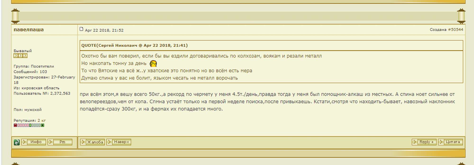 QUOTE(павелпаша @ Jan 25 2019, 14:09) Извиняюсь за позднюю реакцию на то что меня вспомнили.Просто у меня ограничен доступ к инету.По поводу фоток могу сказать следующее:я решил сделать лучше-предлагаю всем неверующим убедиться во всём в реале,"билет" стоит всего 50т.р. Короче,предлагаю пари:ставлю выше названную сумму на то,что наберу тонну за день,начиная с 5 мая. На 10 человек хватит ресурсов с разведанных месторождений,потом будем импровизировать,так что,прошу занимать очередь. Кстати,компаньона я нашёл 2недели назад совершенно случайно,обещал приобресть головастика к началу сезона.А газель я всё-таки этим летом взял,однако толку мало:водителя-то всё равно пришлось нанимать,деля 50 на 50. Если нет фото, то хотя бы чеки с приемки должны остаться, Если Вы столько собираете , то за две недели сумма будет больше 250тр и надо подавать декларацию). Копал металл почти весь май 2018г,ну как весь, три дня копаешь один перерыв)( уаз буханка+ два раба+ две террки) в среднем 470кг получилось .Если больше 500 -это повезло. ,,Рабы,, не филонили, у них сдельная оплата. |