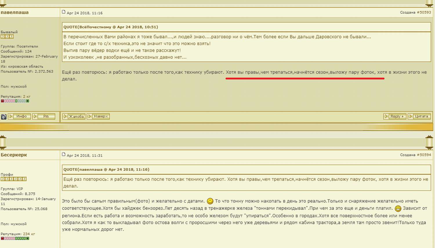 Один раз еду утром, еще по темну, стоит дедок на окраине соседней деревни, курит. Ну думаю еще темно остановлюсь перекурю с ним, заодно поспрашиваю как и где). Дедок сначала настороженно начал, пришлось срочно переводить на тему, что з/п маленькие и приходится металл искать чтоб прокормиться. В беседах с такими людьми важно высказать недовольство о власти , о том что на пенсии не проживешь (ну это реально), цены высокие, дрова дорогие и т.д.. Вот после размера пенсий дедок и нашел во мне хорошего собеседника. Похаяли всех)). Спустя полчаса уже светло и я понимаю что уходит время поиска и надо останавливать беседу и ехать дальше. Тут дедок говорит поехали 500м и я покажу тебе где есть метал. По моим данным до старой мусорки было еще около 1км и воспринял слова деда несерьезно. Но он настойчиво , сынок поехали там есть металл. Ну спустились с ним в начало давно заброщенного карьера, где все давно заросло. Дедок вышел из машины и показывает площадку 100*100м говорит тут стояла техника, А тут показывая на еле заметную выемку в обрыве был склад запчастей. А там, показывая на стометровый обрыв старого карьера, вообще лежит целый карьерный экскаватор, т.к пополз грунт и он свалился на полсклона лет 40-к назад. Дедок еще раз показал на склад и сказал ищи тут есть металл и пошел пешком обратно. Достаю деус подхожу к этой выемке старого склада и деус с полутора метром дает понять что вся еле заметная выемка в металле. Копаю - первый трак и шестерни на полметра в земле и это верх щтабеля сложенного)). Два дня шоколада и выбил. После искал этого Дедка-призрака, хотел отблагодарить, но по описанию никто его не знает из деревни. Вот так среди выбитых деревень попалось удобное место и габаритный удобный метал. А дедок явно работал там, чтоб так точно показывать места.) Но такое было только два раза за сезон. |