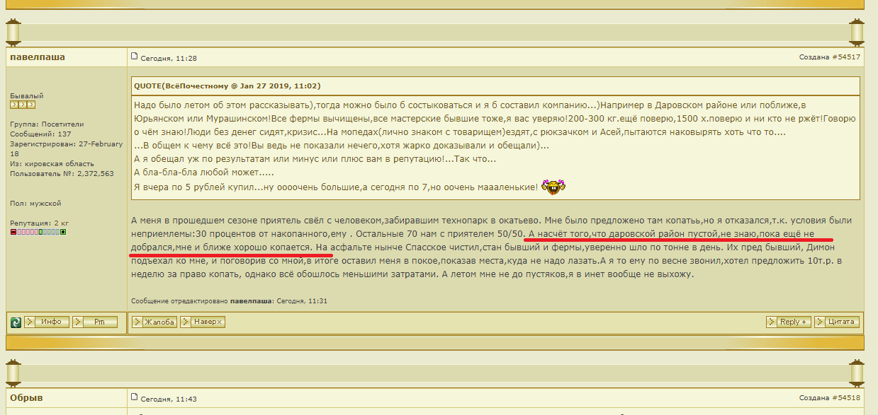 QUOTE(Обрыв @ Jan 27 2019, 14:06) Да раскройте секрет здесь на форуме.) Теперь , после такой рекламы районов народу там будет больше, все равно увидят этот секрет. Секрет заключается не в практическом понимании. Здесь и так народу роется много,но это ничуть не влияет на результативность моей деятельности.Даже если конкуренция мультипликативная,на моё благосостояние это мало повлияет. Здесь ещё нужно знать,куда не надо лезть,в некоторых местах можно и по щам получить (в Парюгском регионе,к примеру |