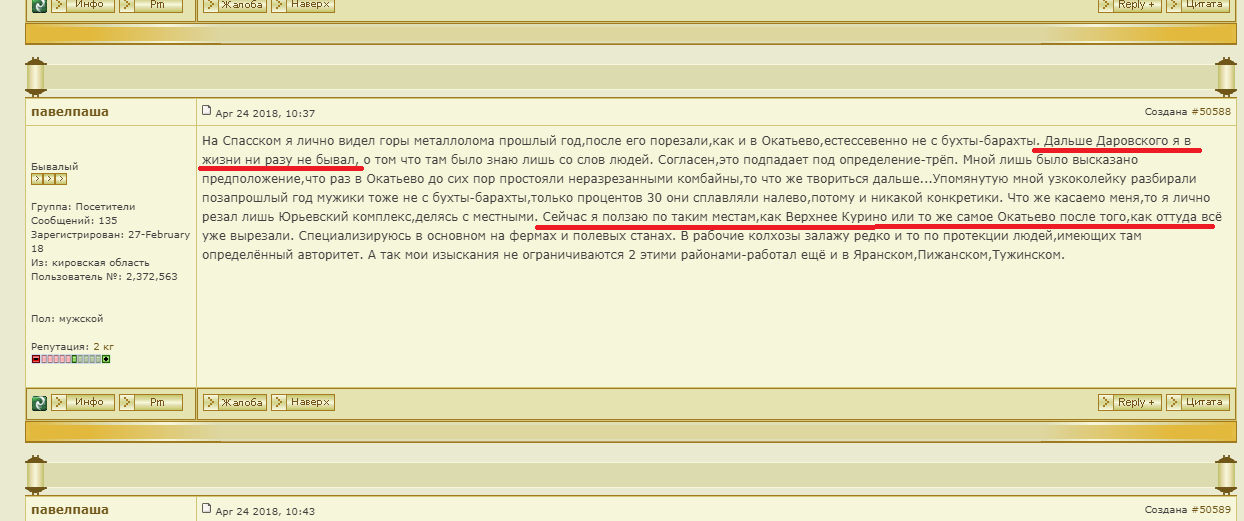 QUOTE(ВсёПочестному @ Jan 27 2019, 13:11) Вы ж не были в Даровском районе никогда?!!!! Снова бла-бла-бла-бздёшь) Не надоело? В этом сезоне я там был,но не работал,а если вы уверены,что всё это левый гон,то забивайтесь на пари.Мне вообще там делать нечего, я в этом сезоне с петуховых,находящихся прямо на асфальте вывез 3 газика,потом с Несветаевых парочку,так что нет нужды мне лезть так далеко. В Кирове я живу зимой,а в тех местах у меня дача и это не совсем Орлов(так я и назвал её местоположение).В общем,хотите-предложение принимайте,а нет-до свидания. От Орлова до Макарья я ездил на велике через Красногорье,это совсем не далеко,бывало и дальше. |