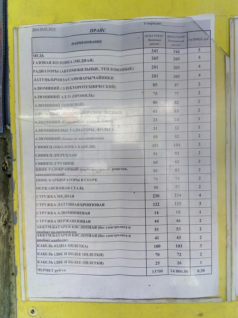 медь - 380 латунь - 230 алюминь - 65 свнец -60 Переплавил пластин от аккумов (наковырял в дерне раздолбанные в свое время), в итоге слиток по массе оказался легче больше чем в в два раза от начальной массы пластин, цена на слиток 60 р/кг, а пластин 30 р/кг (аккумуляторный бой), так что аккумы плавить не выгодно, либо я такой рукопоп ) |