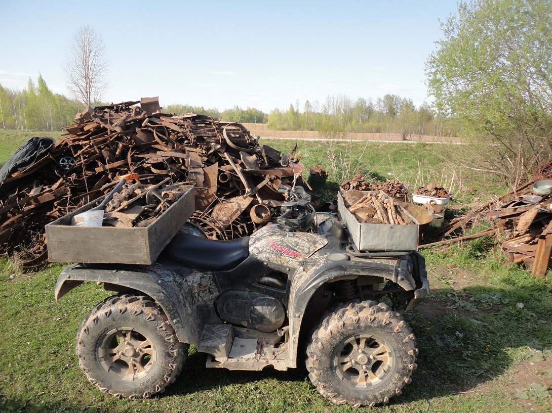 Приветствую.Хожу всегда по монеткам,но если еду за 15-20 км. ,то обратно возвращаюсь примерно так.Когда квадрик был новый,то 200 кг привозил,сейчас больше 150 не беру,а то развалится по дороге.Металла всё меньше становится,приходится к концу дня часа 3 уделять железу.Вчера повезло - в одном месте несколько траков и шт. 60 пальцев гусеничных.