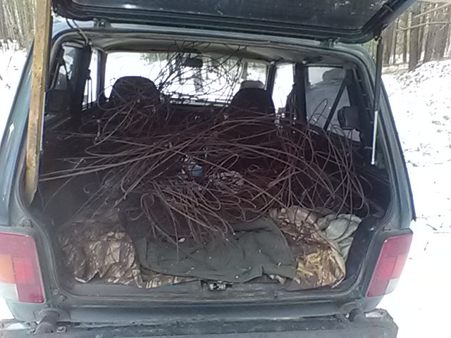 Вот о чем говорил ранее проволока уже крышу рвет, а вес фигня с отрезной машинкой и проводом тянущимся из машины от инвертора ниче не выходит проволока не локально лежит а вдоль дороги и чтоб ее так резать замучишься с проводами! Комкать сильнее не получается-жесткая собака, может все же ножницы купить недорого какие., что бы кусками ее а не мотками грузить? Кстати то что в багажнике час работы