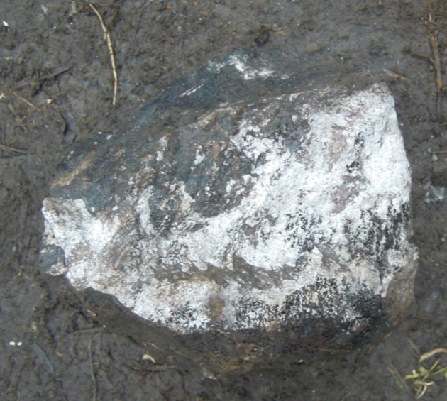 Попалась вот такая штуковина килограмм на 10, хоть с виду не большая но тяжелая, сверху темного цвета, орет цветниной,колется как стекло, цвет скола серебристо белый, не магнитится что это может быть