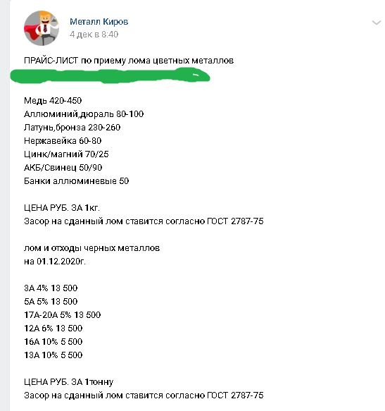 QUOTE(егерьсаша @ Dec 7 2020, 18:32) Трудягам привет! Как там с ценой на чернину , лезет вверх или слезает, давно не сдавал, сегодня узнал 16,700 тонна (Великоустюгский Вологодской) это нормально ??? Сдавать , или может подождать Добрый вечер Коллеги.Здравия Всем! Вот такая цена на металл в Кирове...(на фото)),данные на 4-7 декабря... Цена как бы не очень большая в Кировской обл. Думаю-16,700 - это хорошая цена! Вложенные эскизы изображений -------------------- Весь день не спишь, всю ночь не ешь — конечно, устаёшь... !