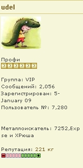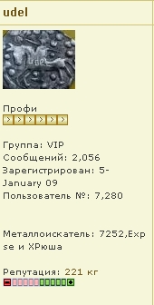 Профи ![]() ![]() ![]() ![]() ![]() ![]() Группа: VIP Сообщений: 4,945 Зарегистрирован: 14-July 11 Из: Вятка Пользователь №: 31,948 Металлоискатель: x-terra 305. 705 Пол: мужской Репутация: 313 кг |