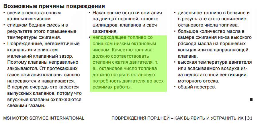 QUOTE(Pfvxc @ Aug 17 2021, 13:20) Добавил бы еще: 6. Неисправен или не туго затянут датчик детонации. 7. Если стоит или стояло гбо - вариатор изменения угла зажигания выеживается. По идее он должен влиять только на работу ГБО, но возможно при неправильном монтаже он влючен всегда а не с кнопки (тут я не сильно спец.) Разницу между 92 95 можно заметить (на гражданском авто, не супер сорт) только в разгоне до 100 увеличившемся на 0.1сек. или с газоонализатором в выхлопной. Исправная машина будет нормально работать бензом -3 от октанового числа. Ещё раз повторю. С двигателем и ЭБУ всё в порядке. op-com имеется. Пользоваться умею . Прошивка заводская Вся проблема в качестве бензина. Он просто плохо горит. Свечи Denso IK16TT (соответствуют модели двигателя).Высоковольтных проводов нет(модуль зажигания одевается на все свечи сразу)так же исправен. есть запасной (так же исправен)привязанное ЭБУ так же есть в запасе .Давление на рампе в норме(3.2). компрессия 15.5 во всех горшках(соответствует новому двигателю)Шайба датчика угла опережения зажигания установлена по шаблону (и ошибок нет) Обе лямбды исправны .Расход топлива 5.2 литра при смешанном режиме-немного выше заявленного заводом изготовителем(4.5) И вообще все эти танцы с бубном я проходил ещё 12 лет назад .Какого бреда я только не наслушался. А нужно было только слить гавёный бензин. |