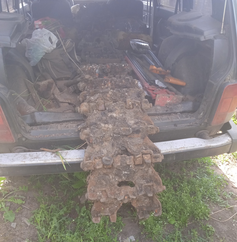 QUOTE(KakTuz @ Jun 14 2022, 13:48) Всё-таки решились мы сегодня докопать гусеницу. И даже докопали, никто её не свиснул. Коротенькая оказалась, всего 15 траков. Зато захрясла так, что разъединить её мы не смогли. Так и пихали целиком в машину, полностью не влезла, остался свешиваться конец (гусеницы надо было к машине тросом и потягать - отошла бы и разработалась. -------------------- Liberté, Égalité, Fraternité