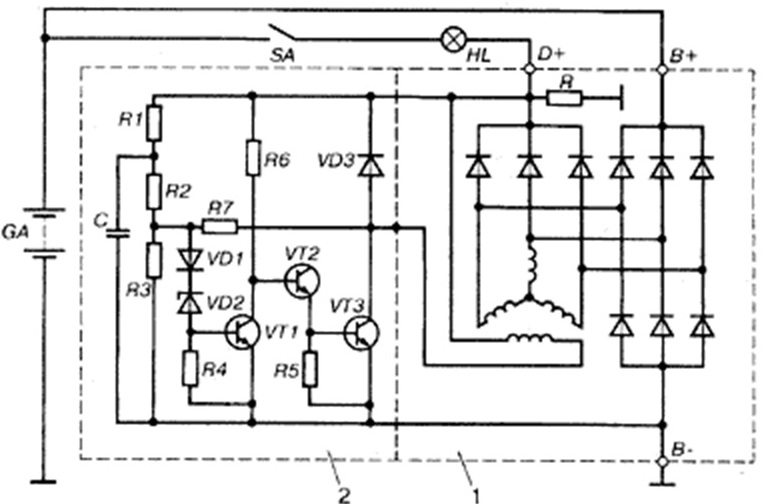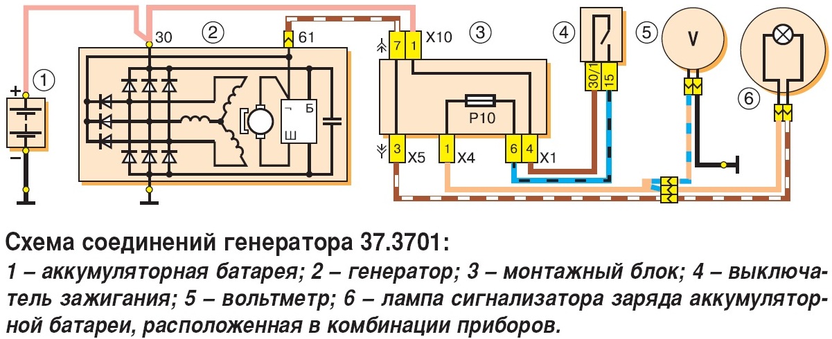 Алексей, вот ещё схема более подробная. С 61 контакта на лампу потом на предохранитель Р10 через замок зажигания 4 и на 30 вывод генератора и аккумулятор. Эту цепь надо проверять. Нет контакта -> нет зарядки.