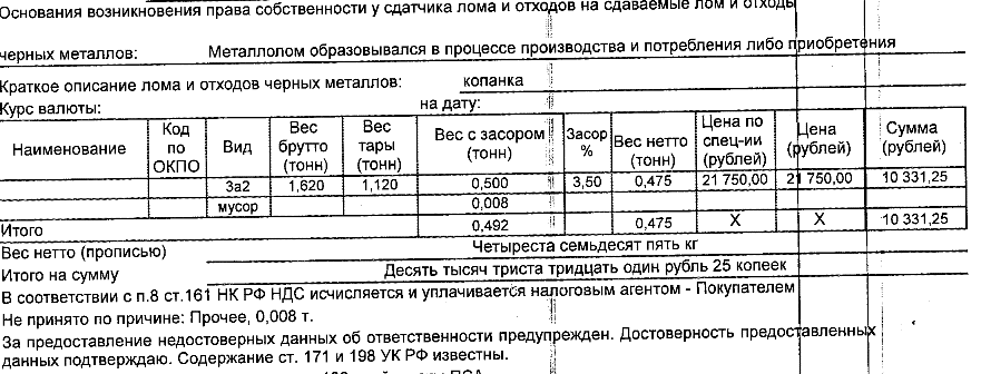 В накладной указанно, что лом образовался в результате использования или приобретении....