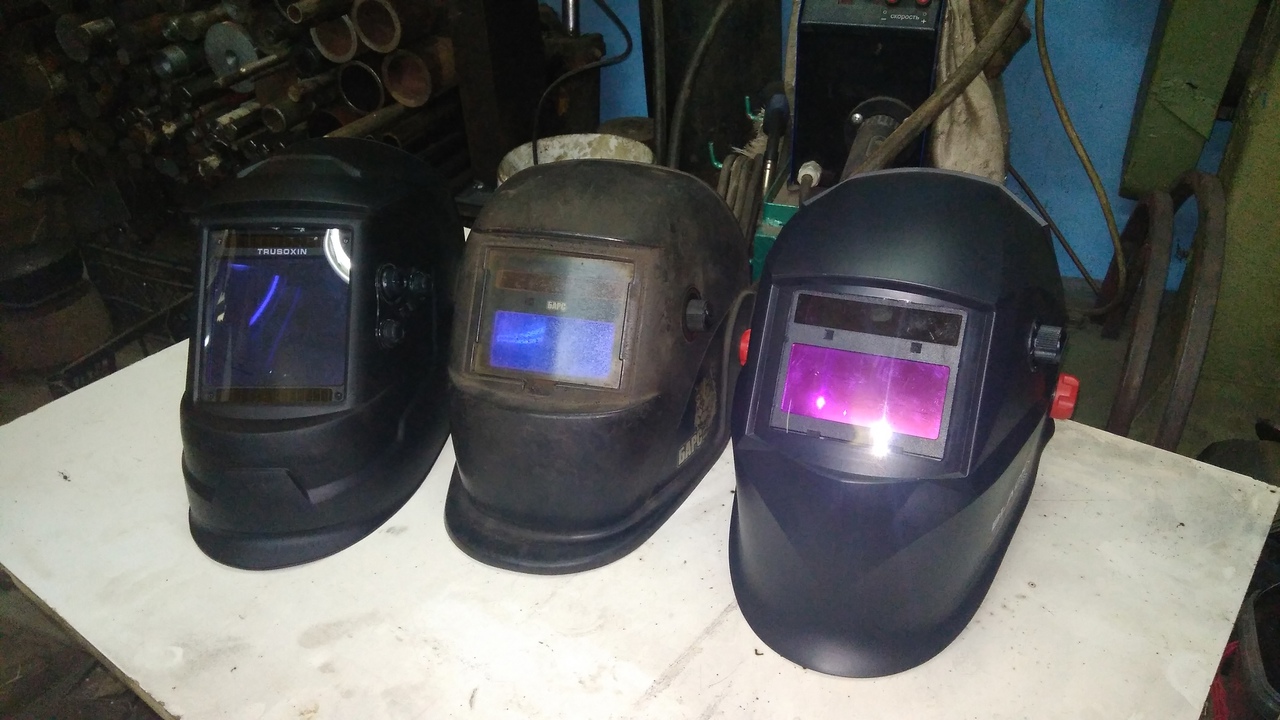 Посередине старая маска, с 10 года примерно, с возрастом стала на ТИГе не успевать срабатывать, возможно батарейка умерла, менять не стал пользовался так, перед зажиганием дуги закрывал глаза, потом нормально работала, в ней еще лопнуло оголовье, обновил для ТИГа с большим светофильтром и 4 датчиками, потом думаю куплю оголовье новое для старой маски, а оно по цене оказалось как целая маска, поэтому купил для ММА и МИГ новую дешевую.