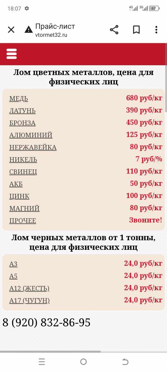 Только безналичный расчет(паспорт и банковская карта обязательно) Деньги сразу!!! Цветные металлы Медь 685 Латунь 405 Стружка латунная 270 Радиатор латунный 405 Медь колонка 435 Алюминий разносортный 95 Алюминий моторный 100 Алюминий радиатор 45 Алюминий электротех 160 Алюминий пищевой 155 Цинк 125 Нержавейка 60 Свинец переплав 95 Свинец кабель 100 Акб авто 46 Акб гелевый 46 Чёрные металлы 3А- 21500 тонна 5А-20500 тонна 12А- 20500 тонна |