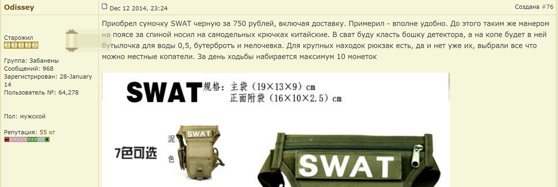 QUOTE(Odissey @ Dec 12 2014, 23:24) Приобрел сумочку SWAT черную за 750 рублей, включая доставку. Примерил - вполне удобно. До этого таким же манером на поясе за спиной носил на самодельных крючках китайские. В сват буду класть бошку детектора, а на копе будет в ней бутылочка для воды 0,5, бутербротъ и мелочевка. Для крупных находок рюкзак есть, да и нет уже их, выбрали все что можно местные копатели. За день ходьбы набирается максимум 10 монеток ![]() Боковой кармашек приспособил для пинпойнтера Доброго времени суток Вам. Подскажите пожалуйста стоит ли покупать сумку SWAT, Вы писали, что приобрели её подскажите как она Вам, удобно или не очень с ней ходить ??? За ответ буду Благодарен. С Уважением. https://www.reviewdetector.ru/index.php?sho...ic=795441&st=60 Вложенные эскизы изображений -------------------- ... лишь постоянный, нескончаемый поиск чего-то — и есть настоящая жизнь.