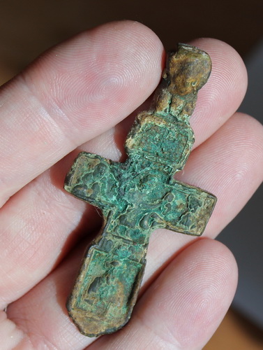 Пока в полях трава, хожу по лесочкам рядом с домом. Один-два раз в неделю. Опыт приходит трудно,но с каждым выходом понимания темы добавляется. Исчезла первоначальная истерия с неудачными выходами. Появилась своеобразная философия поиска чтоли. Последние 5-6 выходов без находок не приходил. 4-6 монеток (почти все ранние советы) каждый выход. Нашел две убитых в хлам деньги. Бродил в окресностях умершей деревни. Находок почти ноль(советы не в счет). Потом пошел побродить вдоль пересыхающей речушки. Сначала несколько дней назад поднял рогатый перстенек 14 века. Состояние не очень. А вот вчера рядом с тем же местом ( это в полукилометре от вымершей в 18 веке деревни) поднял в неплохой сохранности медный крест, примерно того же возраста,что и перстень. Возможно,что там тоже было поселение, но оно не обозначено нигде. Есть повод еще побродить повнимательнее. Вложенные эскизы изображений -------------------- Место для написания очередной глупости)