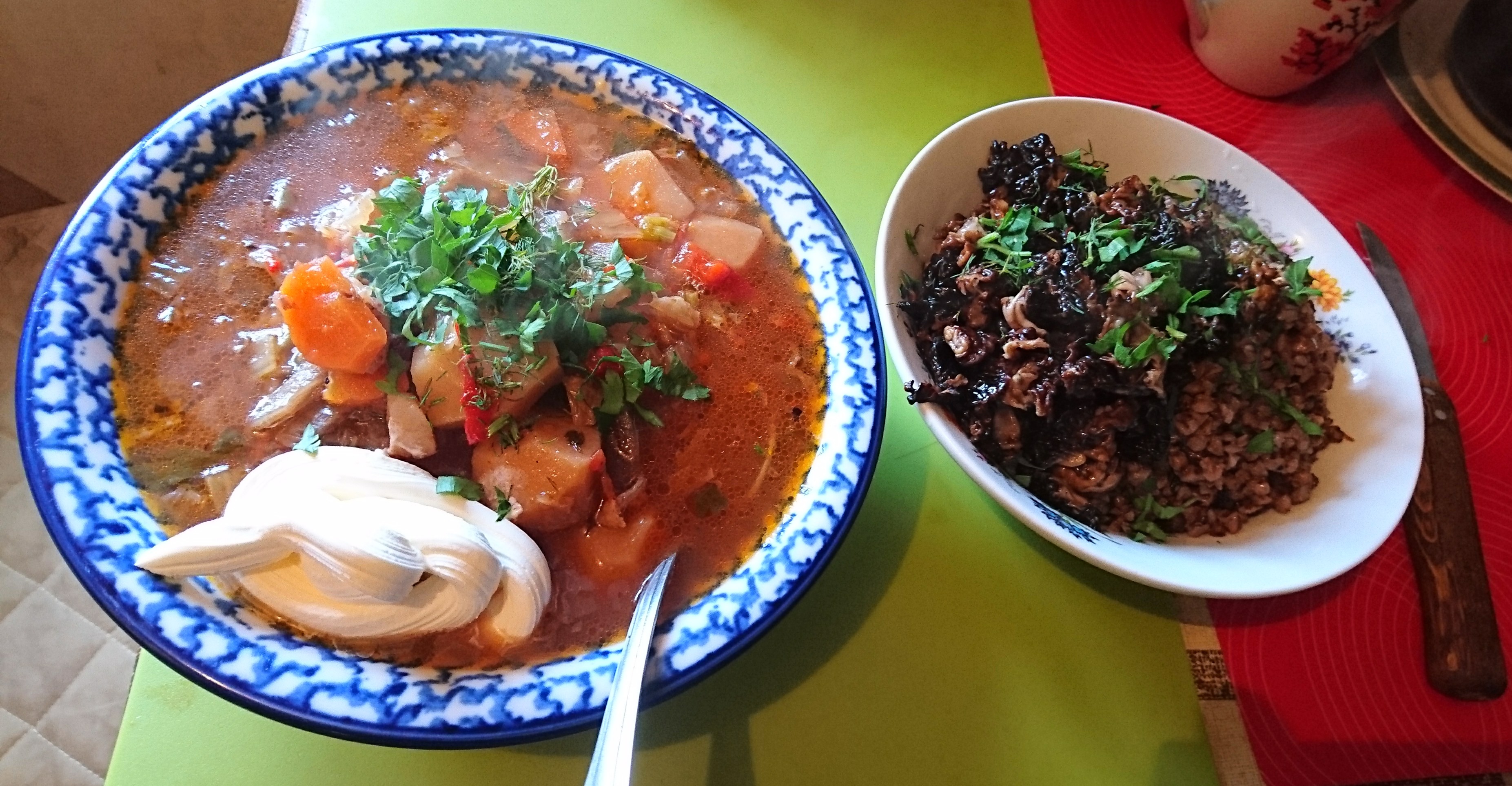 QUOTE(Алекандэр @ Apr 17 2017, 10:26) Тут каждому свое, ни на чем не настаиваю, но борщ лично для меня - это на косточке Кстати, Петрович, а не потребляешь только мясо, или совсем вегетарианство, без курицы, яиц, рыбы и молочки? У меня был как-то жизненный период без мяса, но достаточно быстро закончился... Но от яиц и рыбы тогда не отказывался... Из животной пищи только молочку употребляю. Ни рыбу, ни яйца, никакое мясо не ем. Борщ с грибами, это традиционно постное православное блюдо. Меня моя бабушка им всегда раньше угощала. А вот такой борщ делаю я в русской печке. И гречневая каша со свежими сморчками, вчера в лесу с женой насобирали. Такой вот нехолостяцкий обед моего приготовления. Вложенные эскизы изображений -------------------- А ты что,рассчитывал здесь увидеть живого епископа?!