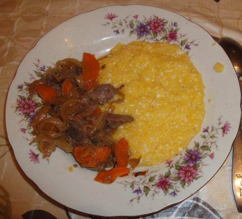 Если никто не против, влезу с холостяцкой тарелкой. Печенка лосиная тушеная с луком и морковкой, каша кукурузная с сыром. Общее время готовки каши - минут 40, из которых сам занят 5, печенки - минут 30, из которых занят 10. По мне, так вполне тарелочка получилась, и вкусно, и сытно (ну или по современному - нажористо
