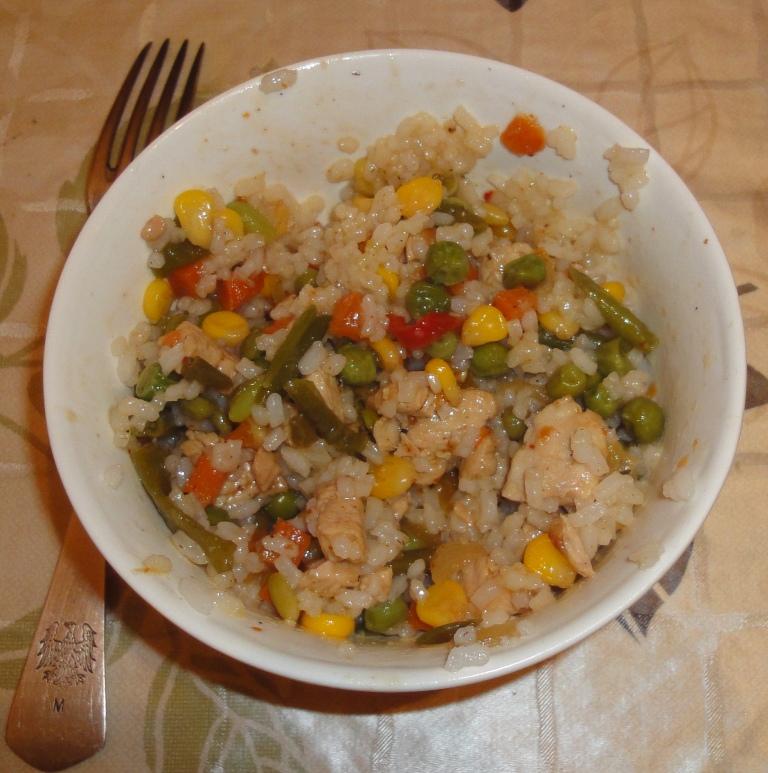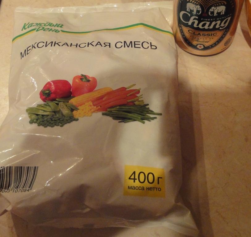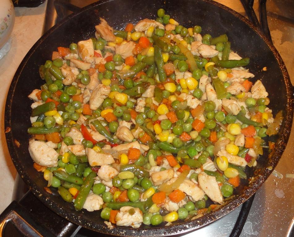 Чуть обжарив курченка - хватаем из морозильника пакет замороженных овощей "Мексиканская смесь".