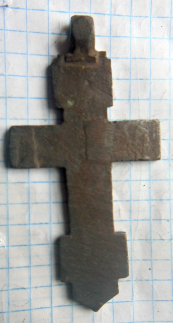 Думаю, что на иконографию в данном случае обращать внимание не надо. Крест поздней работы: 1) крест явно отлит с костяного креста - откуда он взялся здесь в 15 веке?, 2) он не просто отлит, он отлит с доработкой форм (см. обратку), 3) аналог его, скорее всего, мог происходить из новгородских земель (родина для костяных и каменных предметов), 4) и ещё, ''гигантизм'' в металлопластике характерен уже для более позднего времени... Все конечно ИМХО.