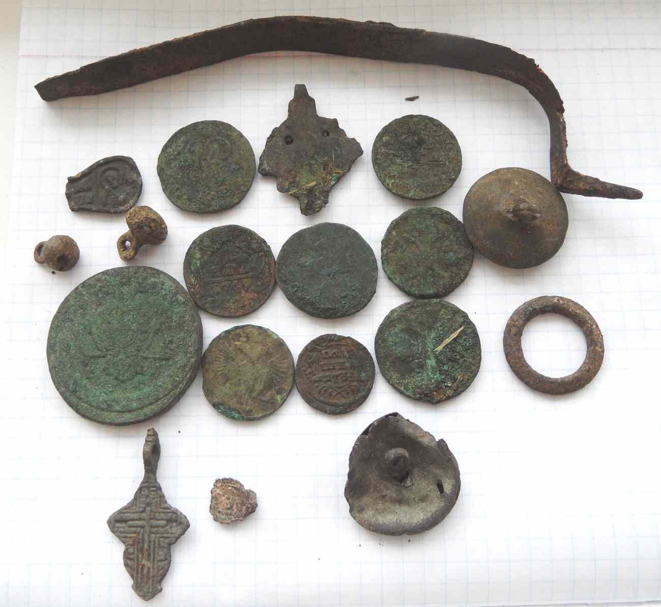 Мужики вчера к 16-00 после работы душа не выдержала думаю хоть на несколько часов но сорвусь копну заодно катуху Неловскую опробую.Вобщем сначало по бугоркам походил мерзлую землю подолбил только крестик , два обломка крестиков и две гирьки, ну думаю для первого копа дело не пойдет надо к Бабушке в огород перебираться,а то как то без монет домой не хотелось возвращатся,а тут уже немного и стемнело ну короче в огороде копнул девять монет, вобщем душу отвел а то спать уже не мог.Сезон отрыт